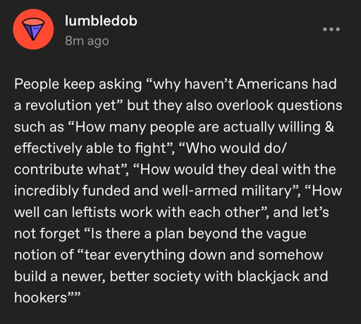 Until those fragile living conditions are threatened. Then people will think “I’m fucked if I do nothing and might not be fucked if I do something. So I will do something.”