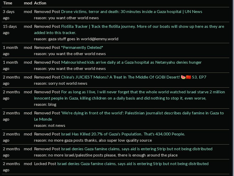 I was just perusing the modlog when I noticed something interesting. Apparently posting news about Gaza/Palestine is not allowed on [email protected]. I decided to check the side bar and didn’t see anything. The only pinned post also does not indicate that this is not allowed