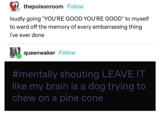 It’s to the point that the two things are sort of reversed in my mind, so instead of recognizing an uncomfortable memory then catching myself humming, I catch myself humming so realize I just remembered something uncomfortable.
