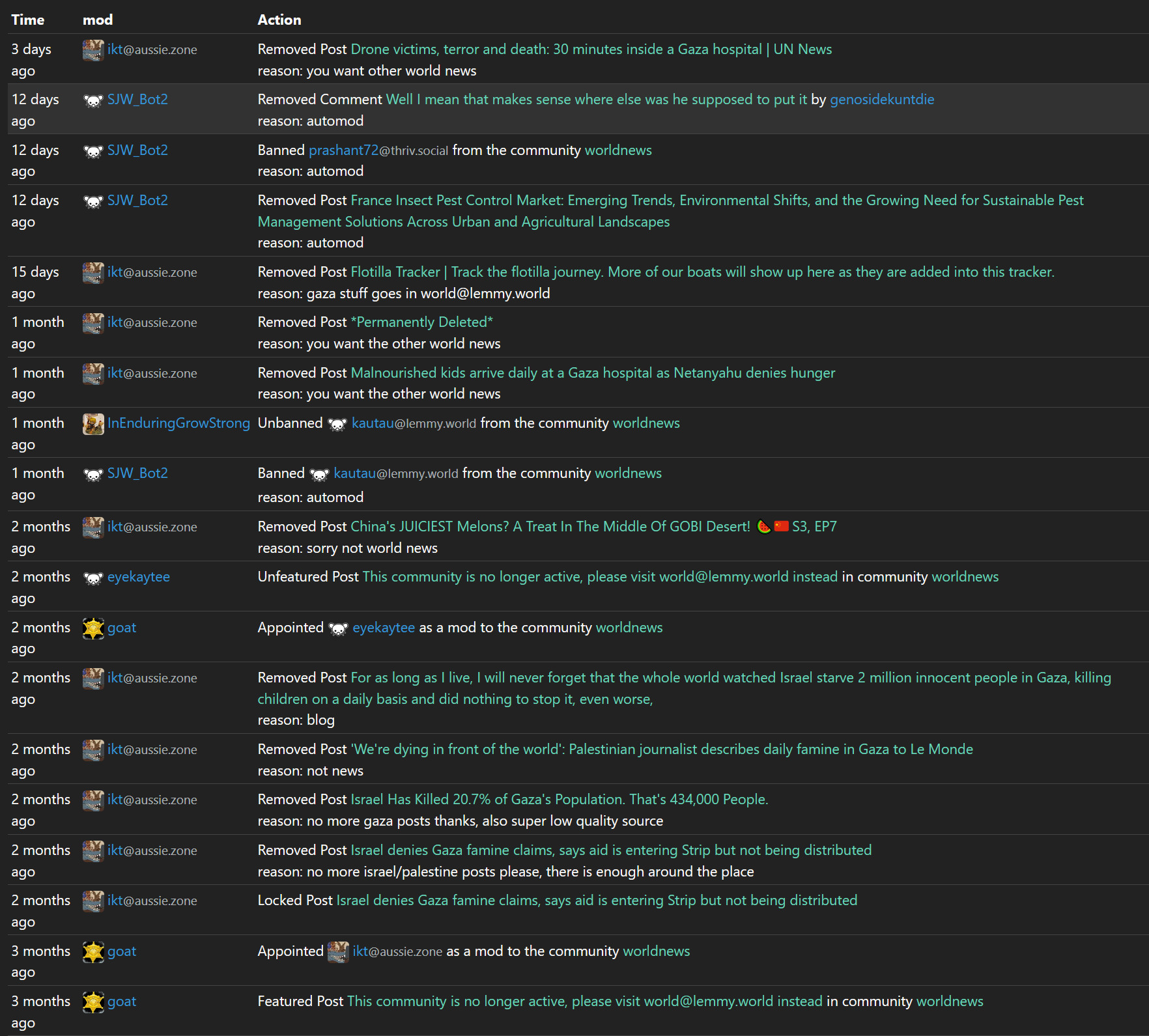 I was just perusing the modlog when I noticed something interesting. Apparently posting news about Gaza/Palestine is not allowed on [email protected]. I decided to check the side bar and didn’t see anything. The only pinned post also does not indicate that this is not allowed