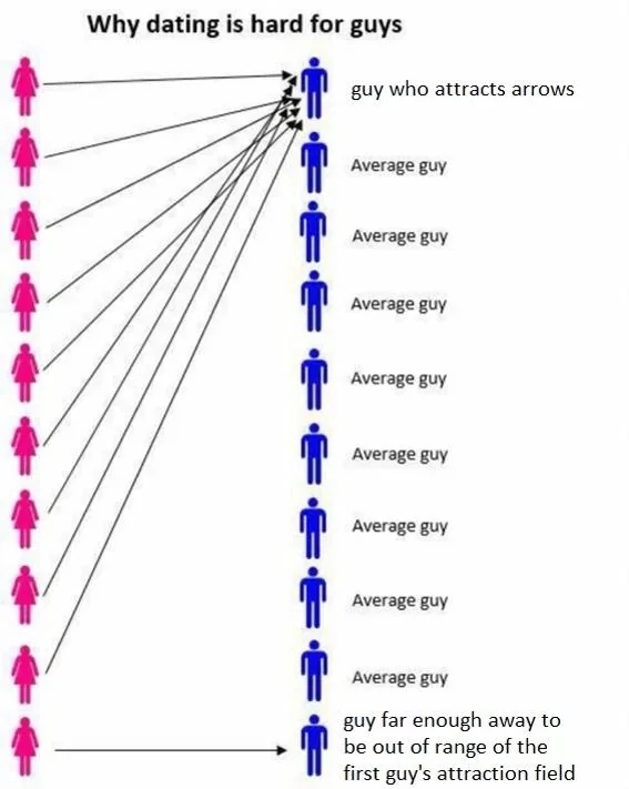 - shouldn’t the bottom label be next to the woman? she is the one outside the attraction field, the guy might as well be within it - There is no arrow from the bottom guy to the upper guy, so… - The bottom guy is typically the one receiving the arrow.